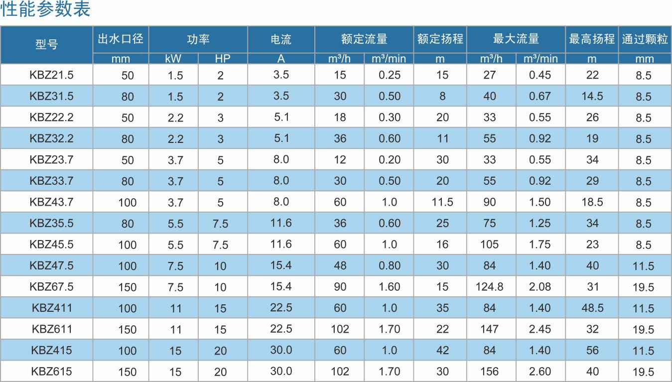 KBZ潜水泥浆泵为下式泵,上出水设计,电机筒侧为整体铸造的出水通道。半内装式,结构紧凑,冷却效果好,可以露出水面运行。特殊机械密封结构保证了较高的潜水承压和恶劣工况环境。半开式叶轮采用耐磨合金铸造,具有优异的耐久性。出水口可以竖向安装也可倾斜向安装,方便使用。全系列采用铸铁机身。功率≤11kW配有内置热保护器。
